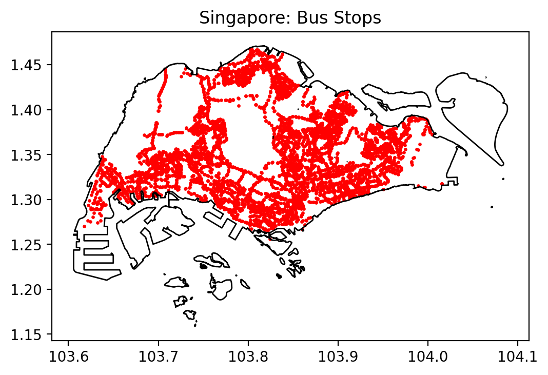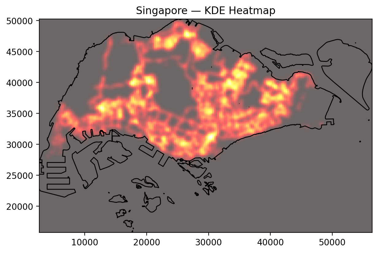 Compared with the point map, the KDE surface smooths local variation and highlights broader structural patterns: Singapore’s bus system concentrates stops along town centres, interchanges and major distributor roads, with somewhat lower intensities in industrial estates and exclusive residential enclaves.