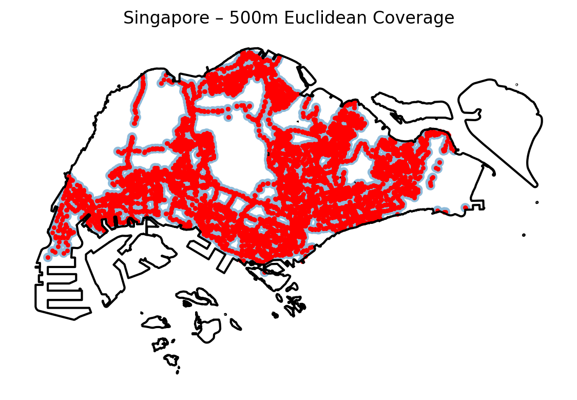 In practice, this means that residential and mixed-use areas are very well covered, but a substantial share of Singapore’s territory is deliberately inaccessible or non-urban. For evaluating everyday access to buses, the network-based map arguably gives a more faithful picture than the simple circular buffers.