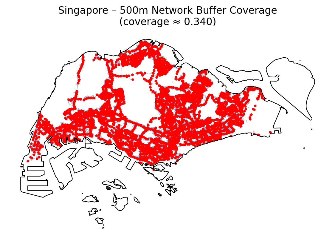 The network-based 500 m coverage map constrains walking distance to the actual street network rather than simple circles around stops. Under this more realistic assumption, about 34.0% of Singapore’s land area lies within 500 m walking distance of a bus stop.
