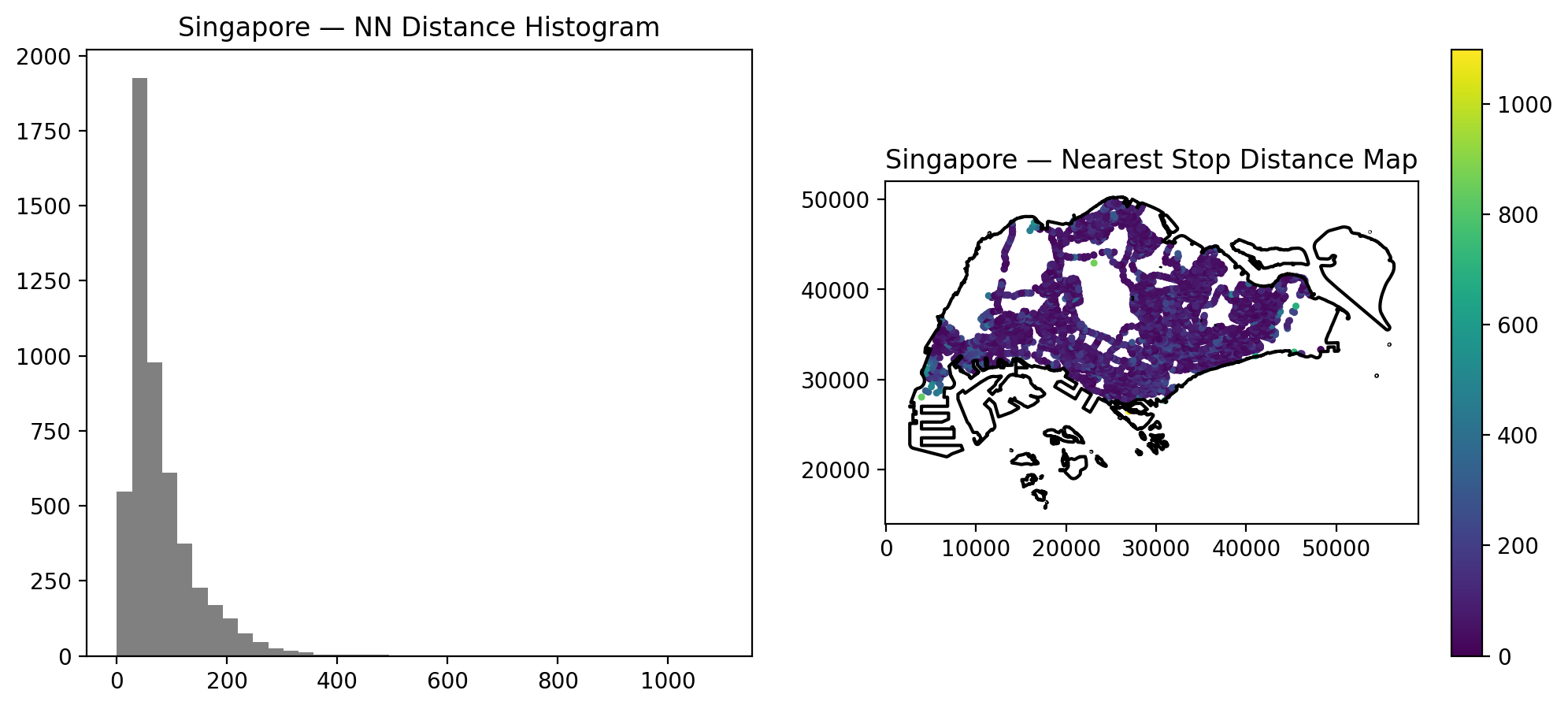 Overall, the nearest-neighbour statistics support the interpretation that Singapore’s bus network provides very fine local accessibility within built-up areas, with only a small share of stops experiencing gaps greater than 200–300 m.