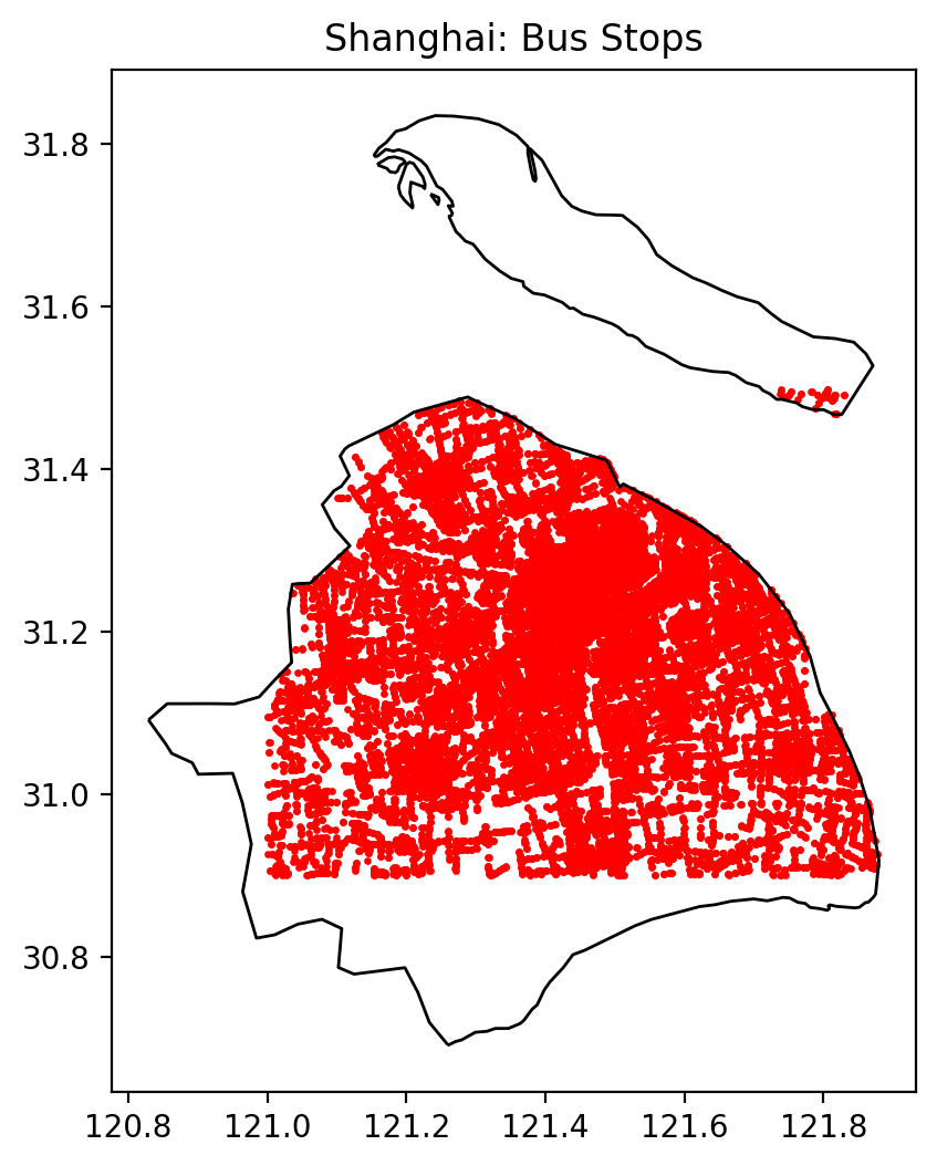 A key data limitation is visible here. The boundary used for Shanghai comes from an open-data administrative layer and represents the entire municipality, including the main urban area and outlying islands such as Chongming. As a result, the reference area contains substantial amounts of water, port land, industrial space and peri-urban green space that are only sparsely served by buses.