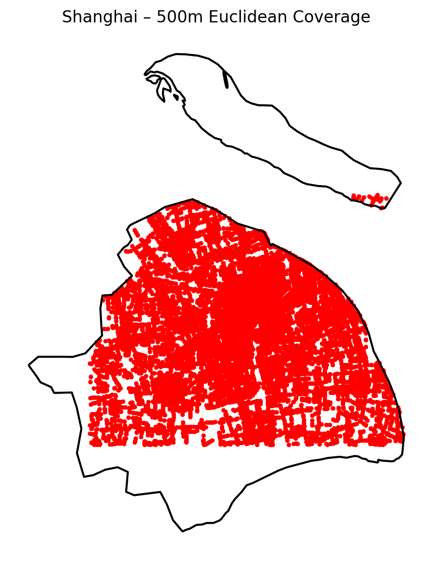 From the summary table, Shanghai’s Euclidean 500 m coverage ratio is about 0.475 – that is, roughly 47.5% of the boundary area lies within 500 m of a stop, corresponding to about 3,855 km² of land. This is somewhat lower than the 55–57% coverage found for the other cities, but still substantial given Shanghai’s very large total area (8,115 km² in this definition) and the amount of non-urban land included in the polygon.