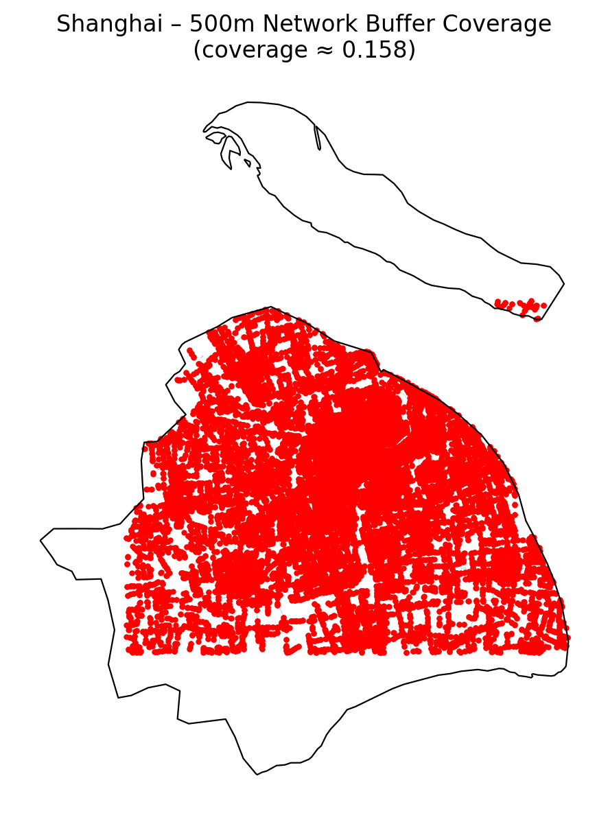 For Shanghai this network-based 500 m coverage ratio is about 0.158 – only 15.8% of the boundary area (≈ 1,281 km²) lies within 500 m along the street network of any bus stop. The contrast with the Euclidean value (47.5%) is substantial and highlights two features of the urban structure: