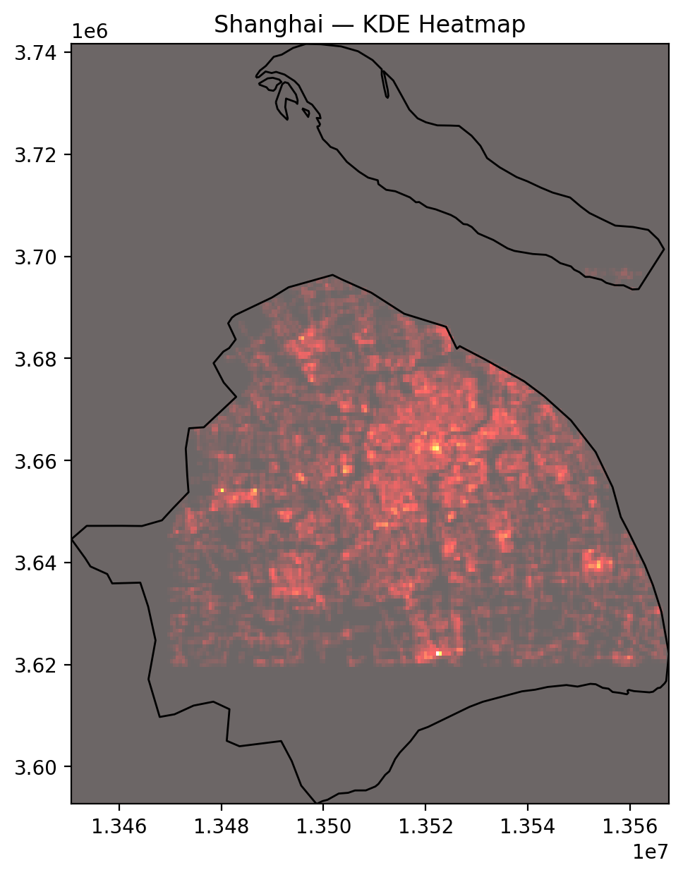 Unlike Amsterdam, where density peaks are tightly clustered around a relatively small inner core, Shanghai exhibits a broad plateau of medium–high density punctuated by multiple hotspots. This pattern is consistent with Shanghai’s role as a polycentric megacity, where employment and activity are no longer confined to a single CBD.
