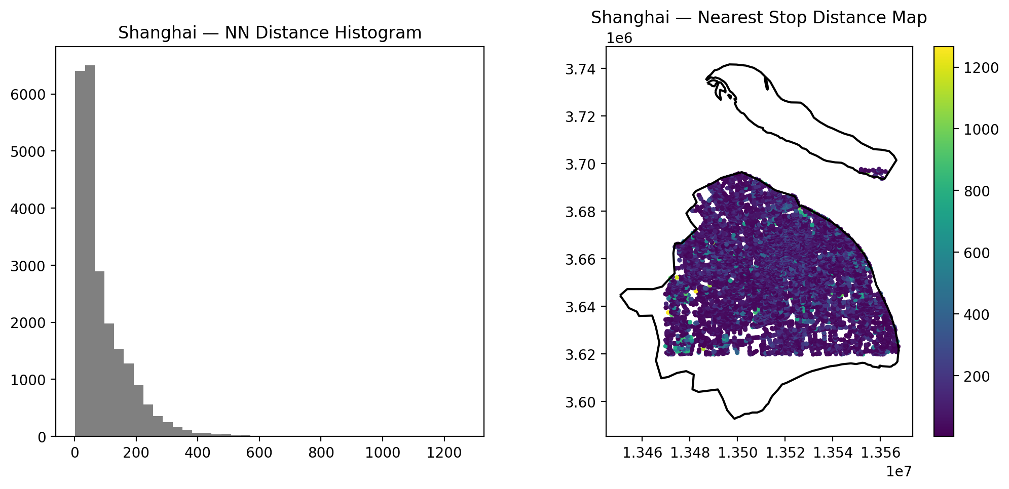 - Shanghai’s mean NN distance (~91 m) is shorter than New York’s (~183 m), reflecting more closely spaced stops and a stronger emphasis on fine-grained local access rather than high-speed bus travel.